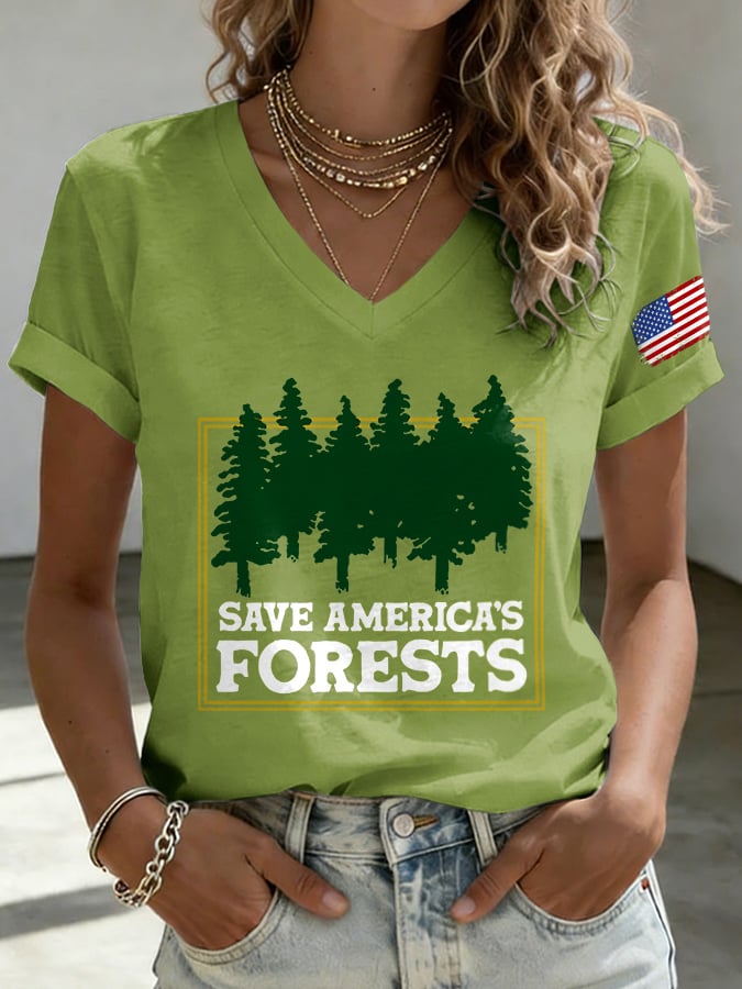 V-Neck Retro Save America's Forests Print T-Shirt