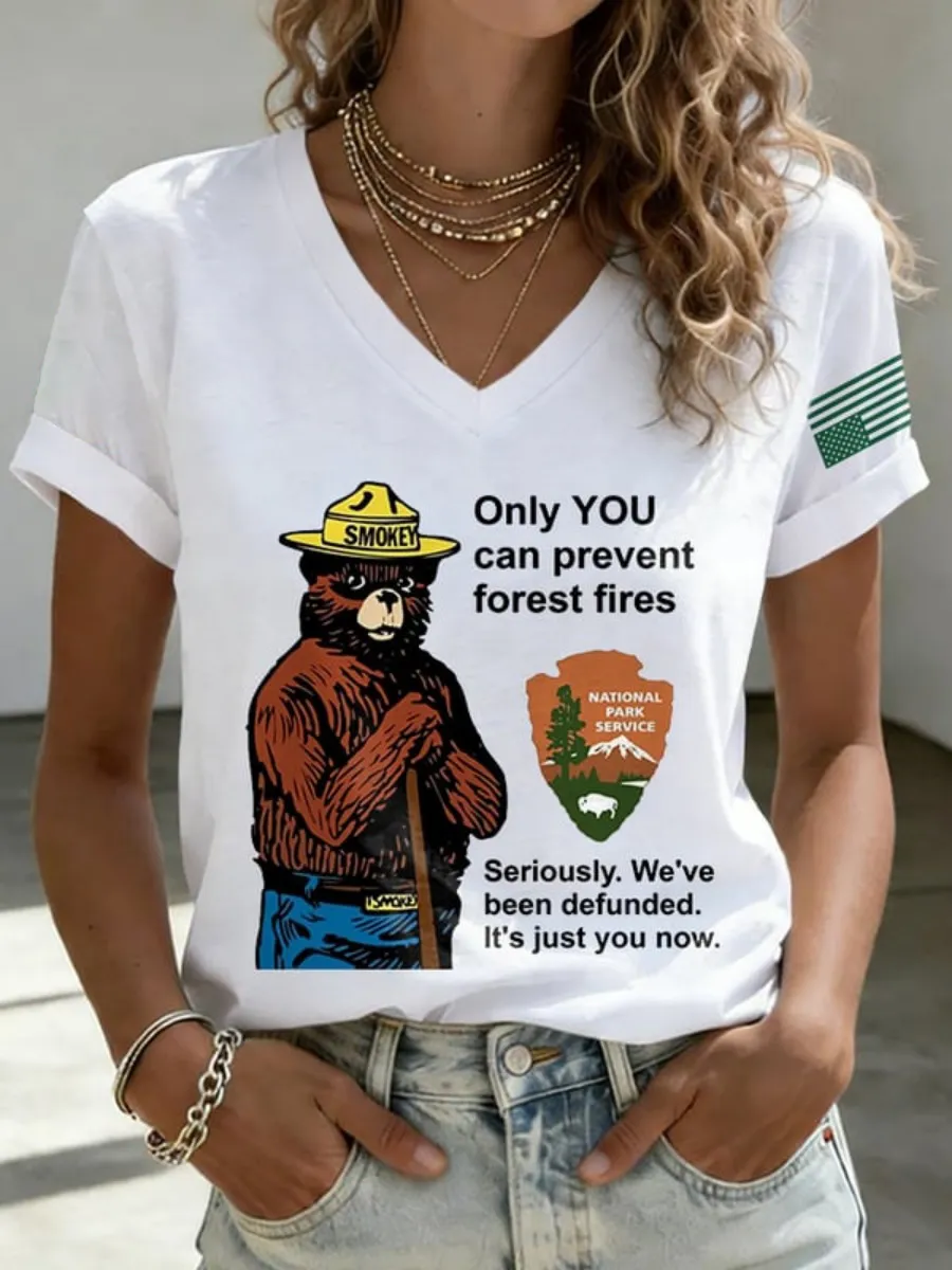 V-Neck Retro Resist Save The Forest Service Only You Can Prevent Forest Fires Seriously. We've Been Defunded. It'S Just You Now Print T-Shirt