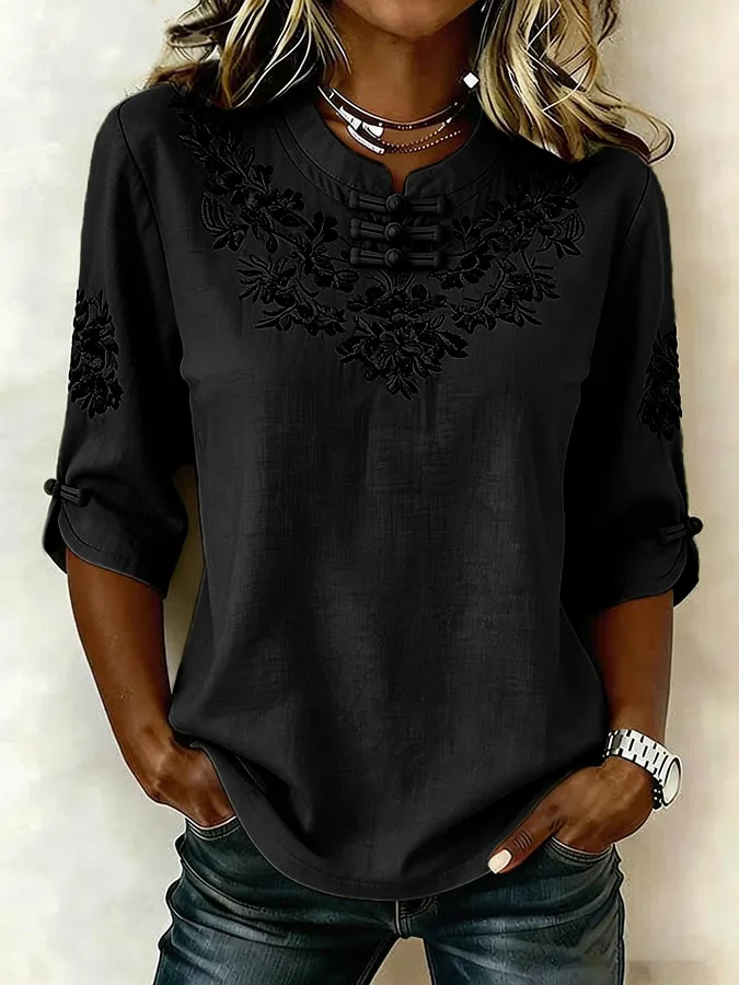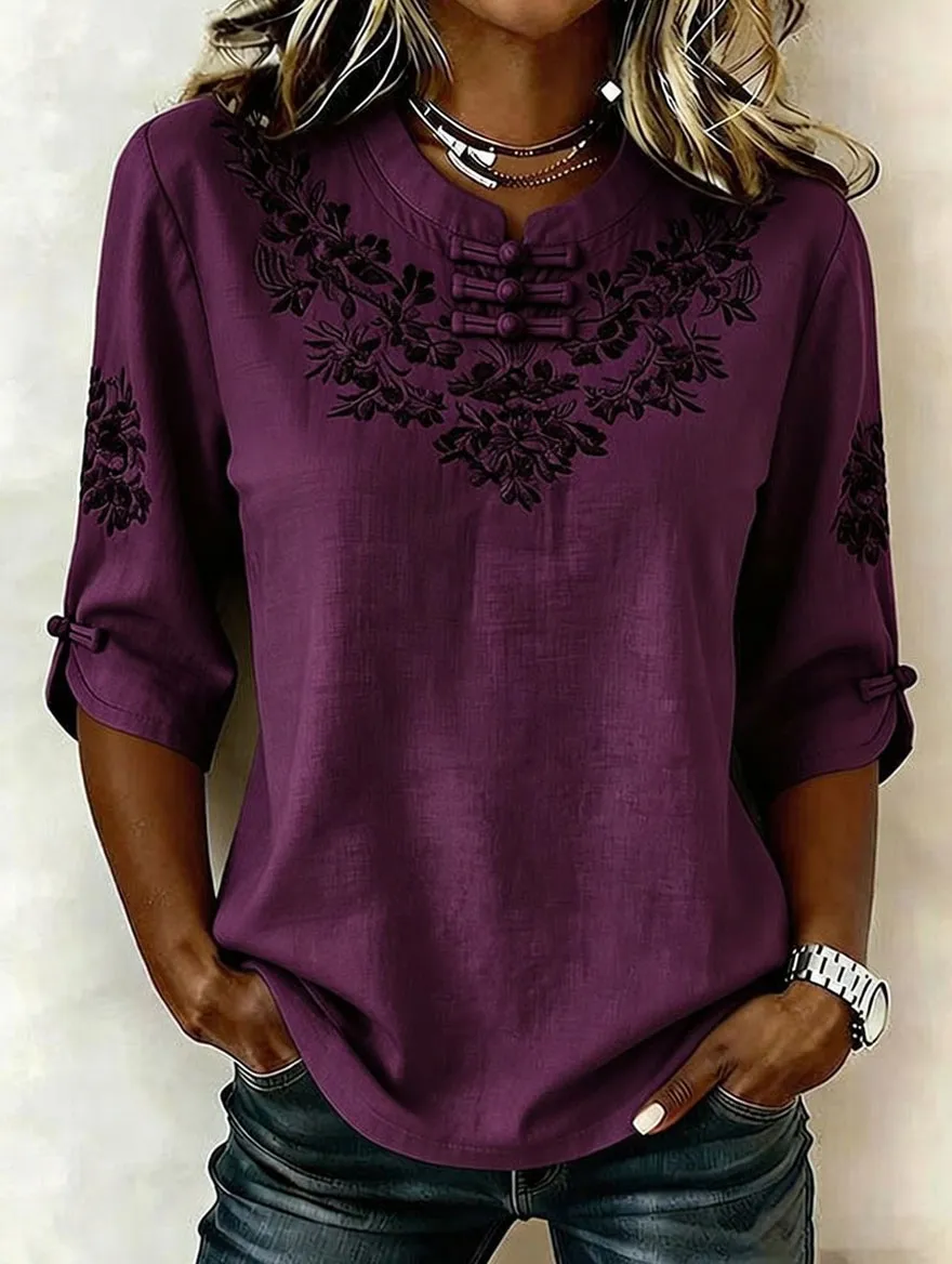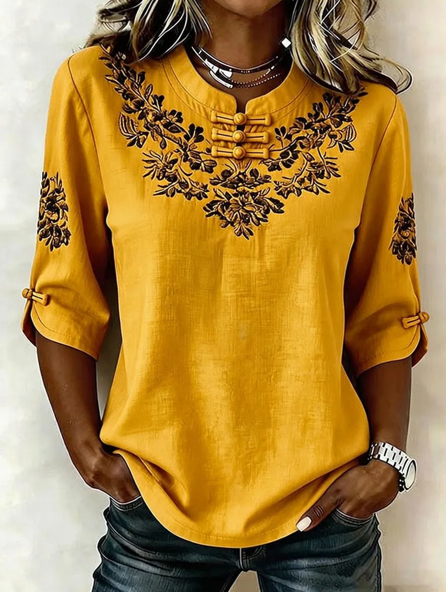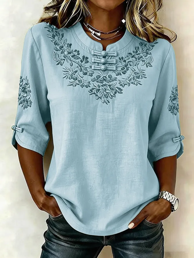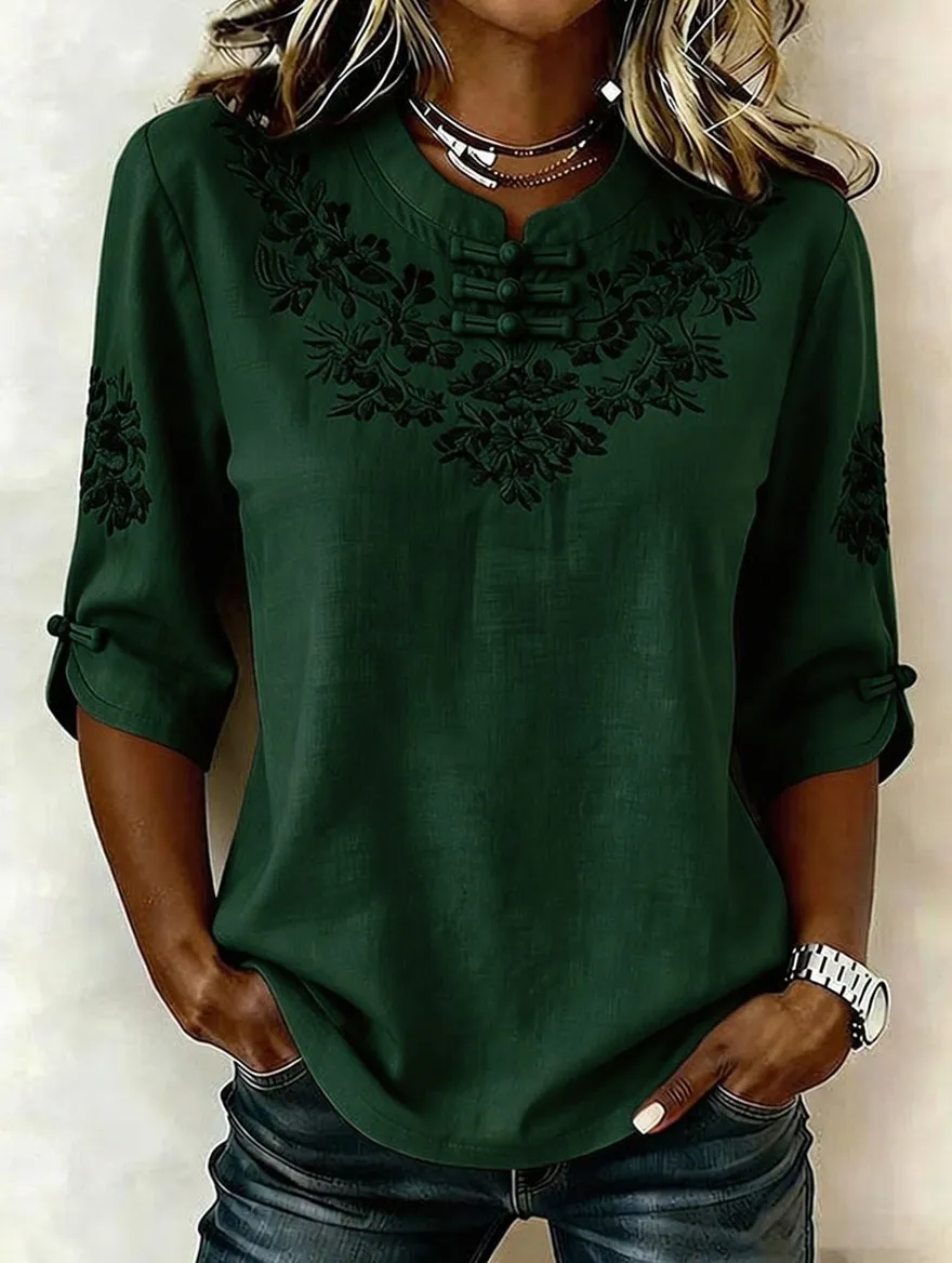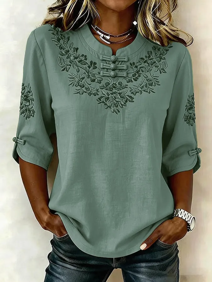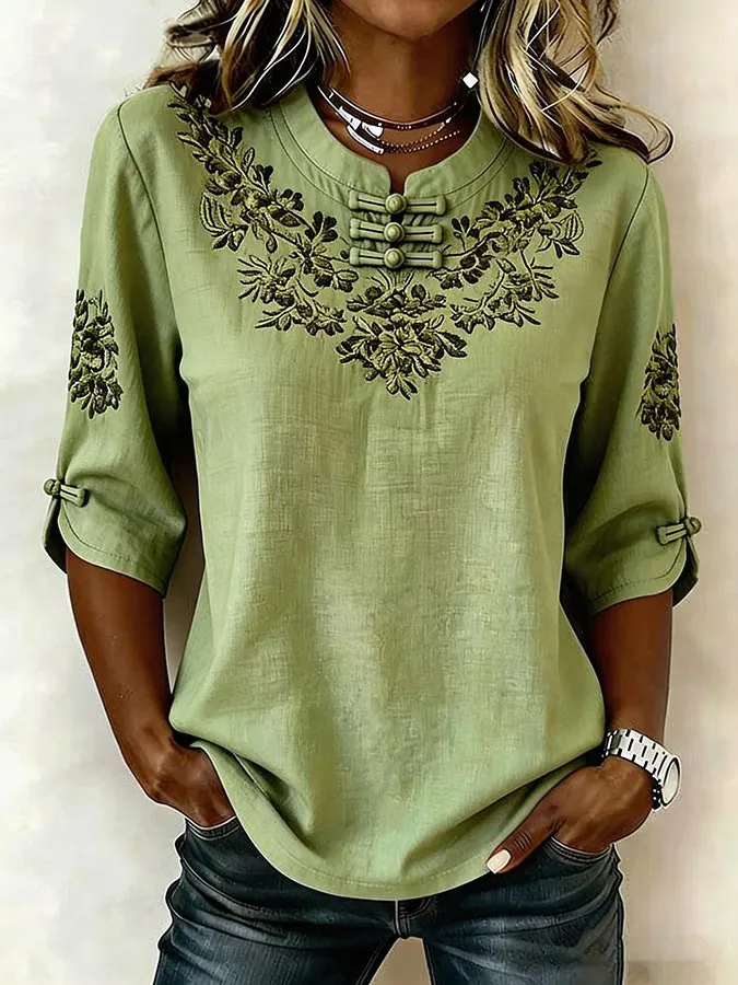 Women'S Retro Cotton Linen Flower Green Printing Design Casual T-Shirt